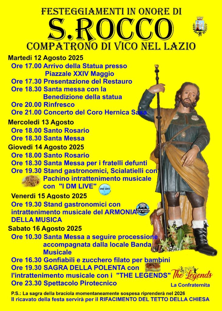 Le celebrazioni prenderanno il via martedì 12 agosto alle ore 17.00 con la solenne presentazione della statua restaurata, alla presenza delle autorità civili e religiose e con l’accompagnamento della banda musicale di Vico nel Lazio. Alle 17.30 la restauratrice Anna Paola Garberini illustrerà il lavoro svolto, mentre lo storico Salvatore Iacobelli racconterà la storia della statua, della confraternita e della chiesa dedicata a San Rocco. L’incontro sarà coordinato dal dottor Giulio Maurizio Giacomini e si concluderà con la consegna di omaggi ricordo.
