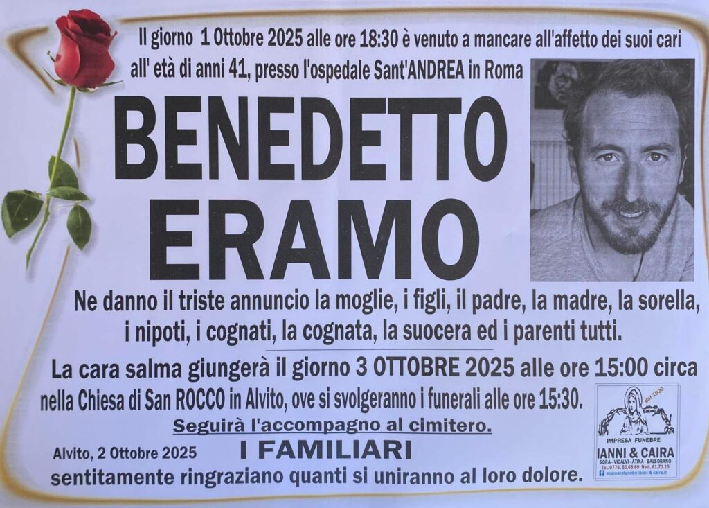 I funerali di Benedetto Eramo saranno celebrati domani, venerdì 3 ottobre, con la salma che giungerà alle ore 15:00 presso la chiesa di San Rocco ad Alvito. Seguirà il rito funebre, curato dall’impresa funebre Ianni & Caira. La famiglia, nel momento del dolore più profondo, ha voluto rivolgere un pensiero di ringraziamento anticipato a quanti vorranno partecipare all’ultimo saluto e unirsi al loro lutto.