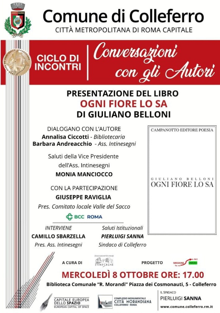 Un appuntamento da non perdere per gli amanti della poesia e della lingua italiana. Mercoledì 8 ottobre 2025, alle ore 17:00, la Biblioteca Comunale di Colleferro ospiterà la presentazione del libro “Ogni fiore lo sa” di Giuliano Belloni, nell’ambito del ciclo di incontri “Conversazione con gli Autori”.