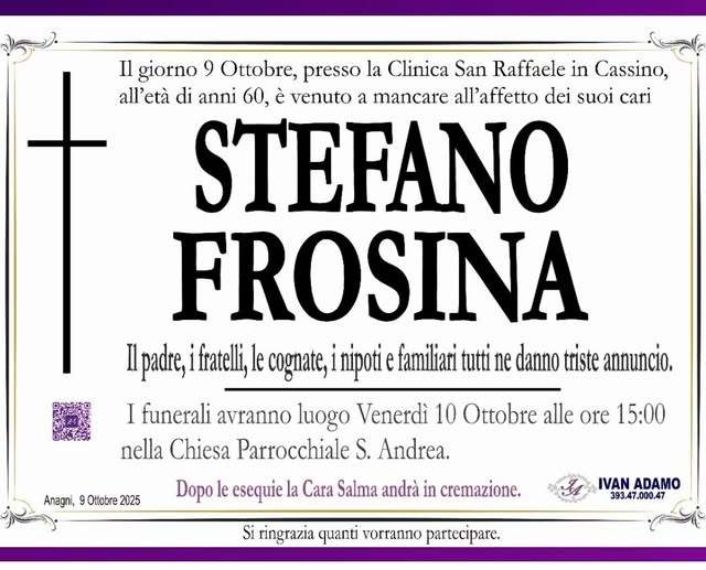 La notizia della sua scomparsa ha scosso profondamente la comunità anagnina, che in questi anni aveva imparato a conoscere e apprezzare non solo le sue competenze professionali nel campo immobiliare, ma soprattutto la sua umanità e disponibilità. Stefano Frosina era infatti molto più di un semplice imprenditore: era un amico sincero per tanti cittadini di Anagni, sempre pronto ad ascoltare e a offrire il suo contributo con discrezione e generosità.