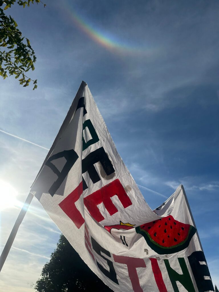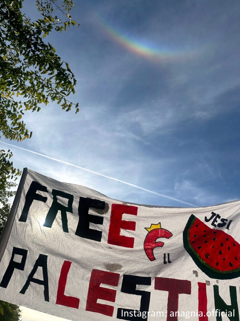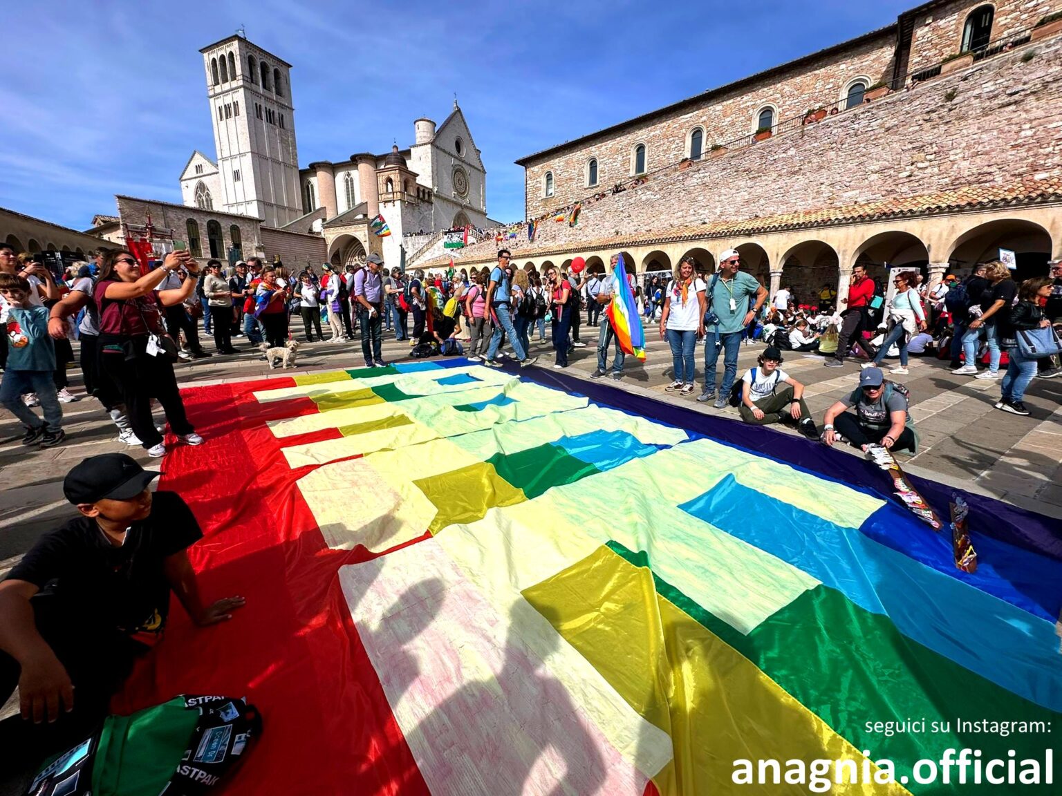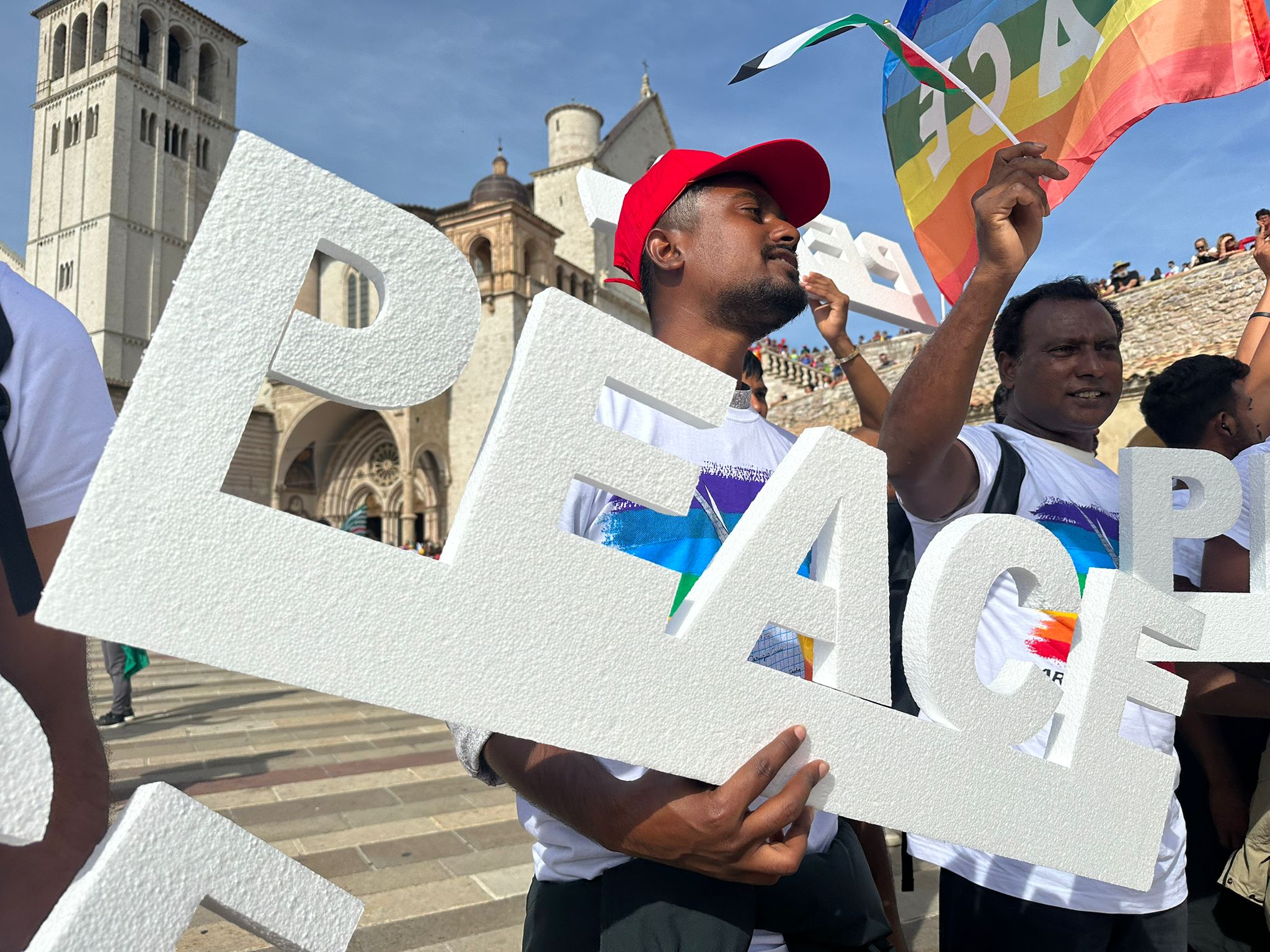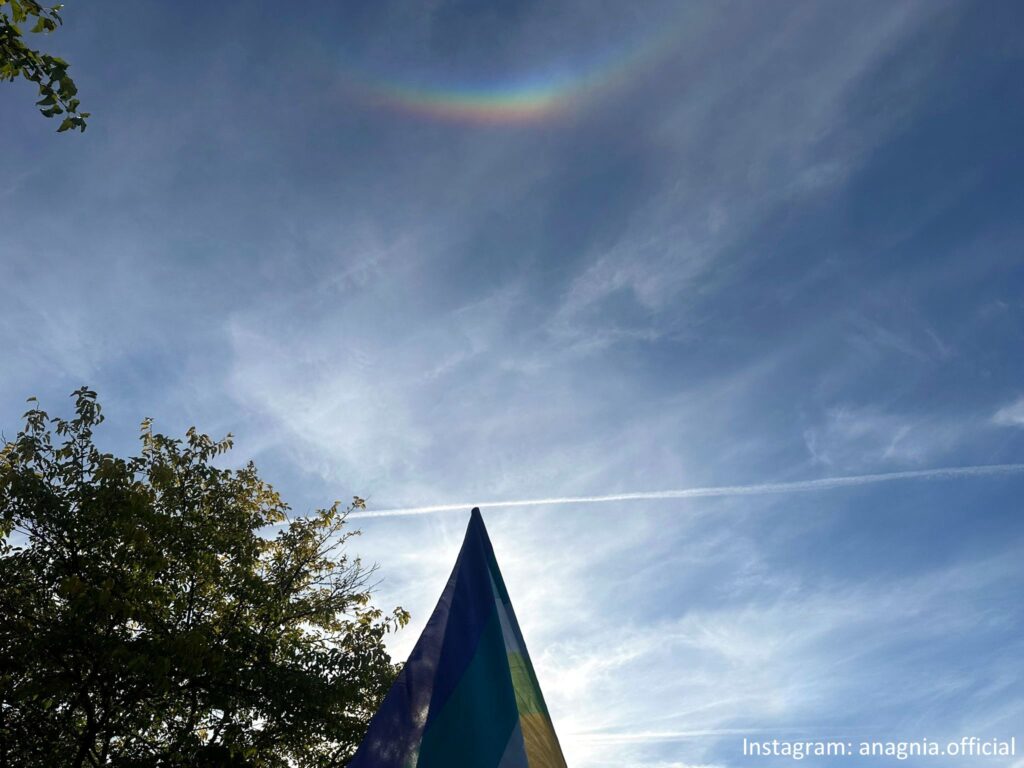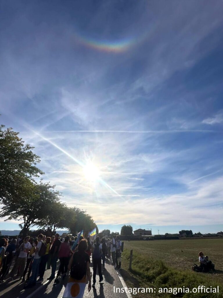 E proprio di orizzonti, nel pomeriggio, il cielo di Assisi ha regalato ai manifestanti uno spettacolo naturale che sembrava echeggiare il messaggio della giornata. Mentre le bandiere della pace sventolavano nella brezza del tardo pomeriggio, un arco circumorizzontale si è palesato nel cielo, creando un pendant cromatico con i colori delle bandiere che gremivano la Rocca Maggiore.