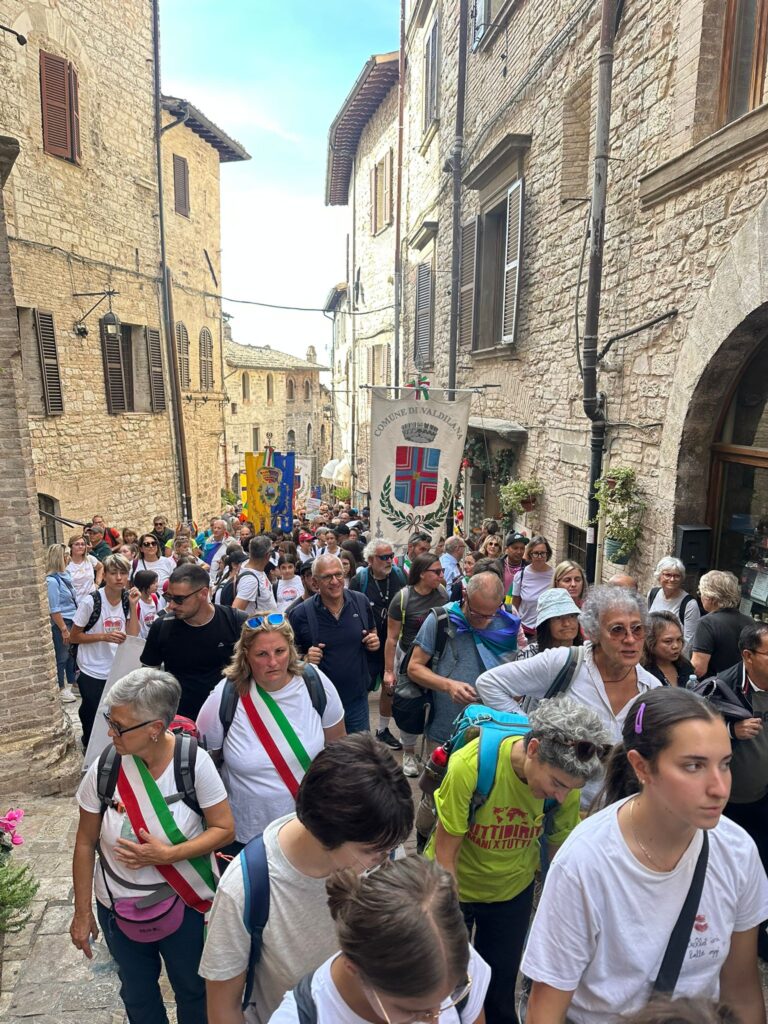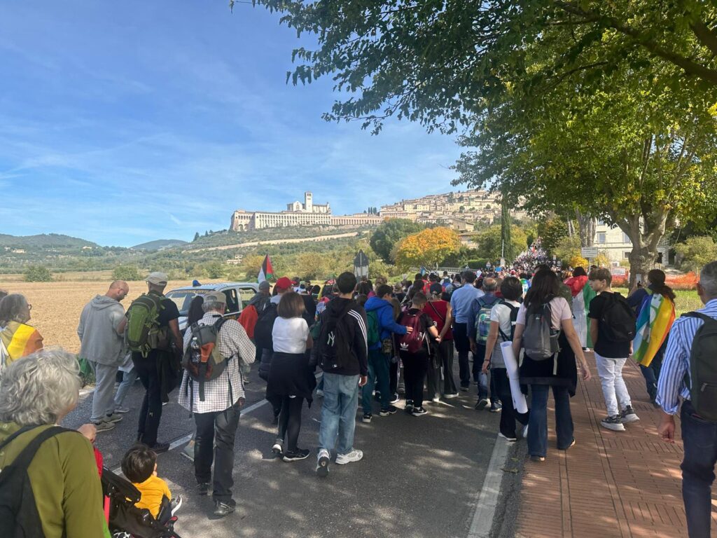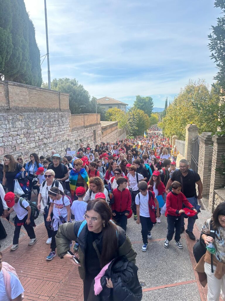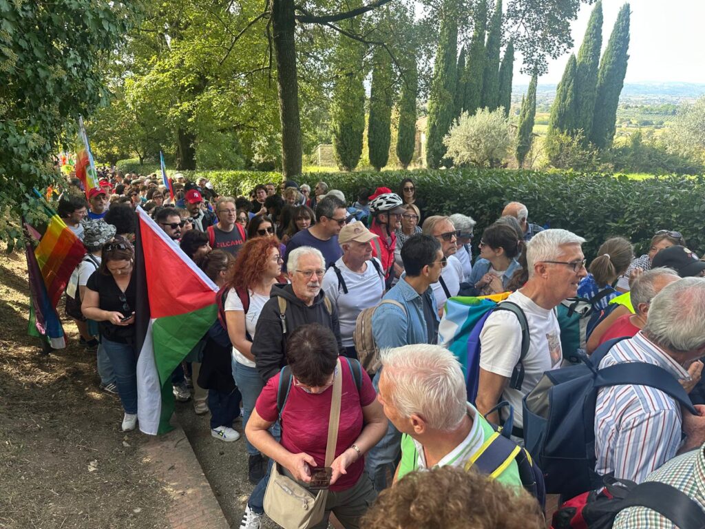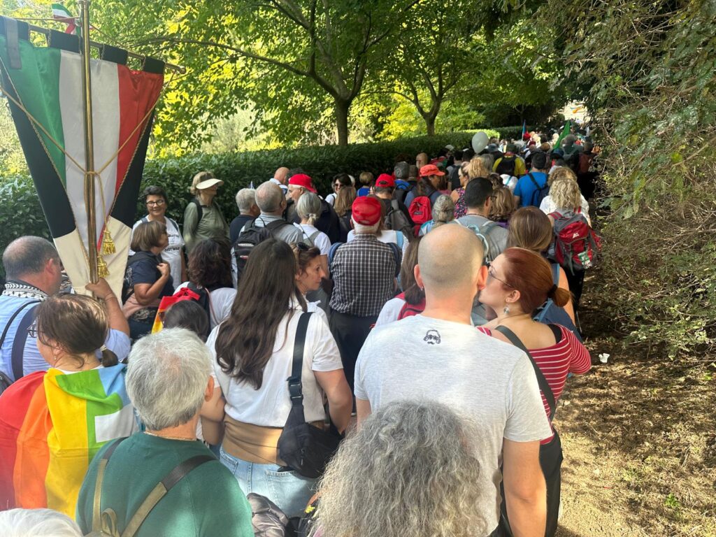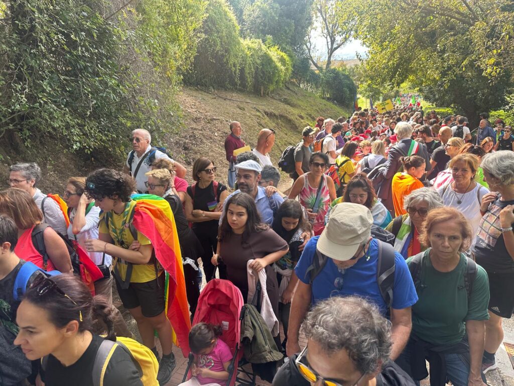 Il corteo è partito alle 9 dai Giardini del Frontone di Perugia per arrivare alle 15 alla Rocca Maggiore di Assisi, percorrendo i 24 chilometri che separano le due città umbre, carichi di simbolismo e memoria. La storica manifestazione, nata nel 1961 su iniziativa di Aldo Capitini, ha ritrovato la sua forza propulsiva, la sua capacità di aggregare e mobilitare coscienze.