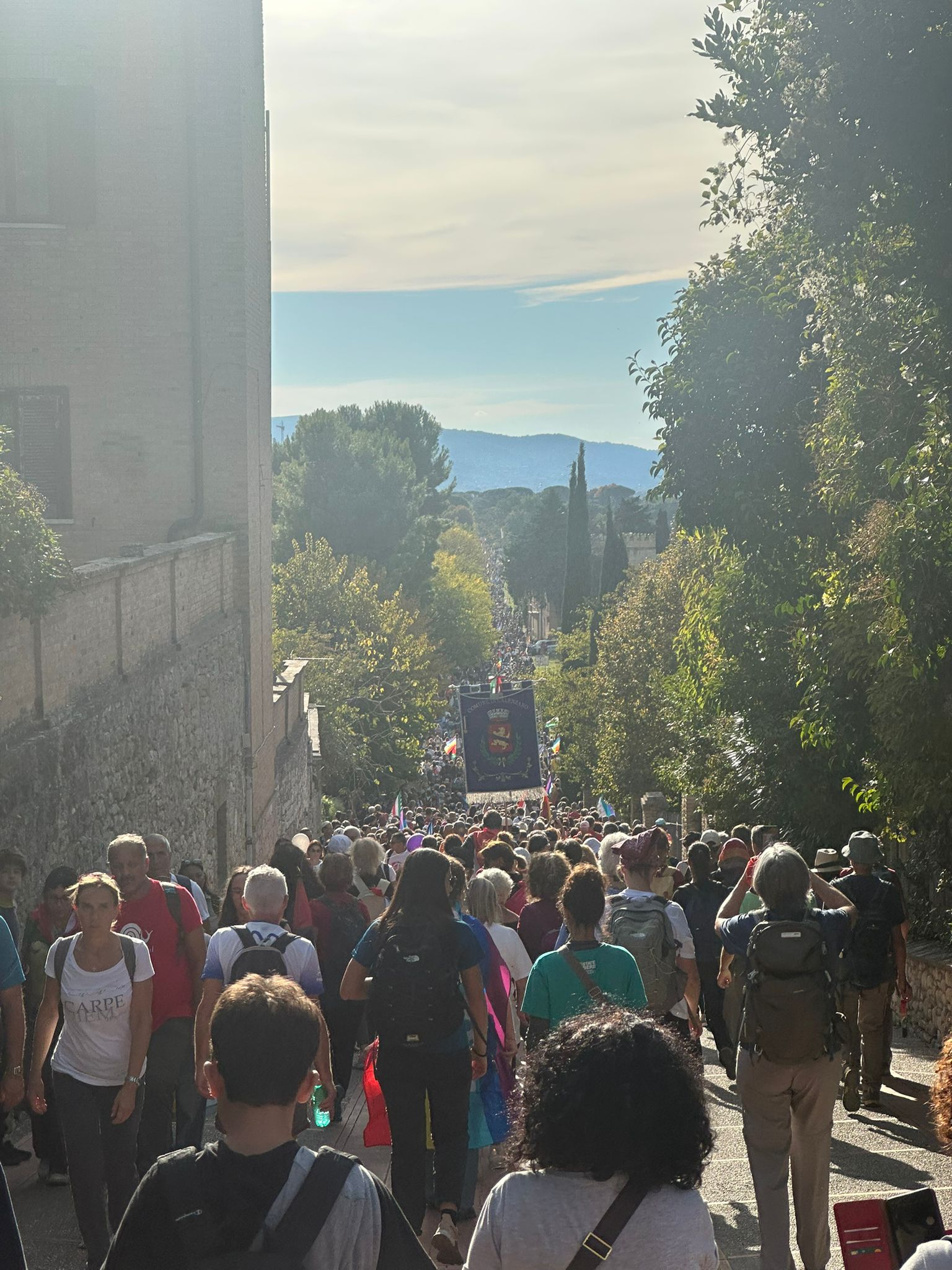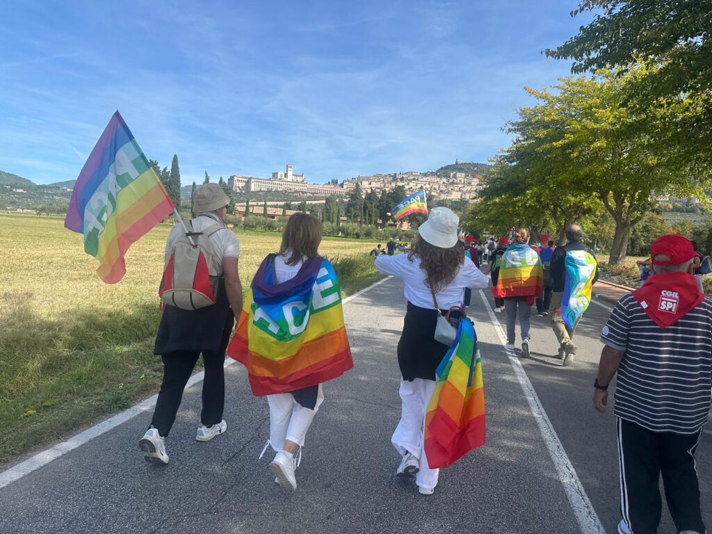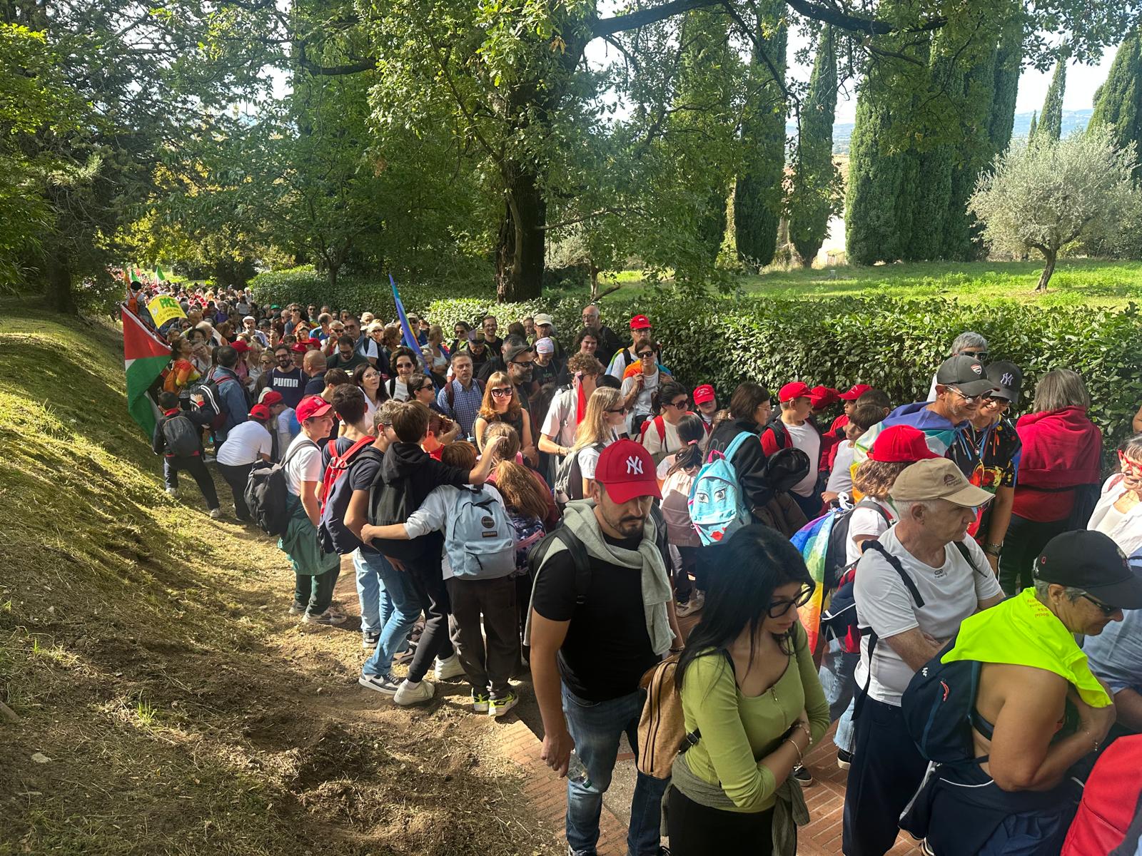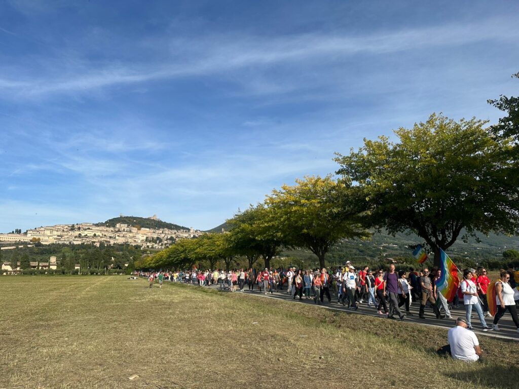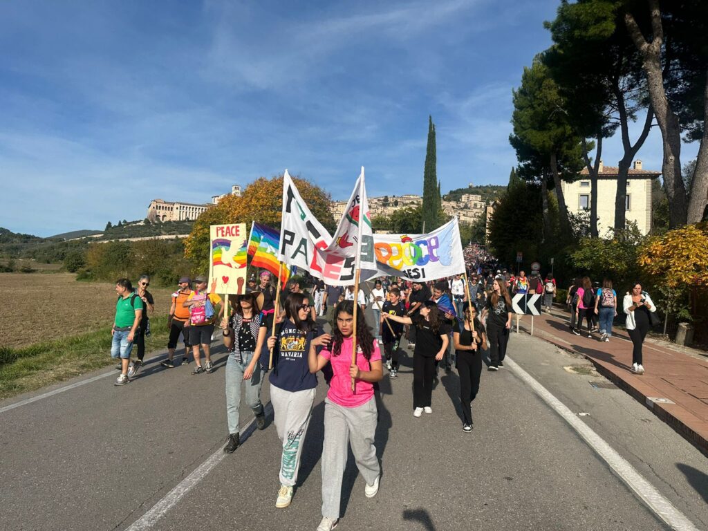 Il corteo è partito alle 9 dai Giardini del Frontone di Perugia per arrivare alle 15 alla Rocca Maggiore di Assisi, percorrendo i 24 chilometri che separano le due città umbre, carichi di simbolismo e memoria. La storica manifestazione, nata nel 1961 su iniziativa di Aldo Capitini, ha ritrovato la sua forza propulsiva, la sua capacità di aggregare e mobilitare coscienze.