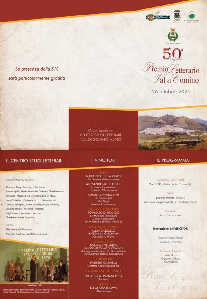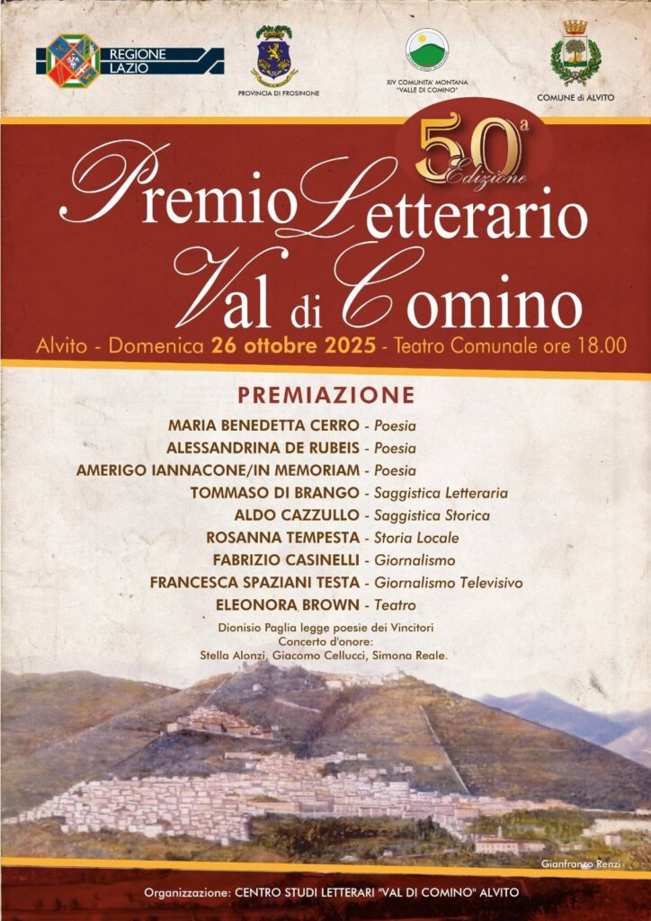 Mezzo secolo di cultura, letteratura e passione per le parole. Il Premio Letterario Val di Comino celebra la sua cinquantesima edizione con una cerimonia che si preannuncia ricca di emozioni e prestigio. Domenica 26 ottobre, alle ore 18.00, il Teatro Comunale di Alvito aprirà le porte per onorare i vincitori di uno dei più importanti riconoscimenti letterari italiani, secondo solo allo Strega per longevità nel panorama laziale.