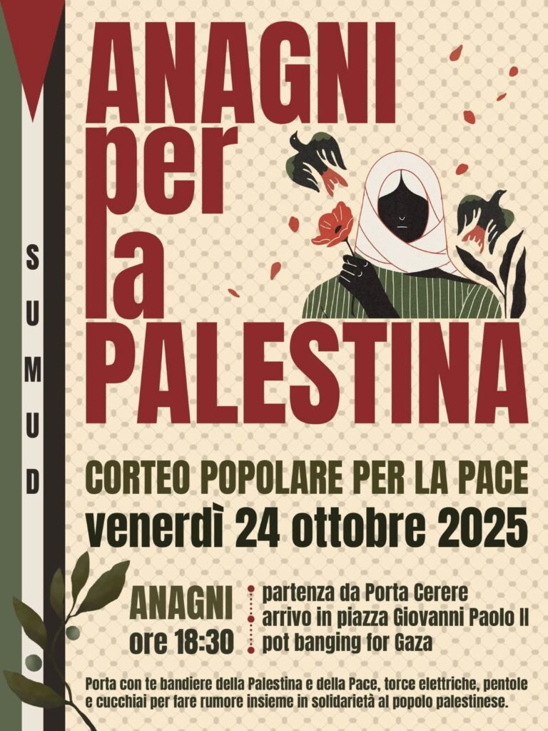 Anagni scende in piazza per invocare la pace. Domani, 24 ottobre 2025, la città ospiterà il corteo popolare “Anagni per la Palestina”, un’iniziativa aperta a tutta la cittadinanza che intende portare un messaggio forte e chiaro: la necessità urgente di porre fine alle violenze in Medio Oriente e di costruire percorsi concreti verso la pace.