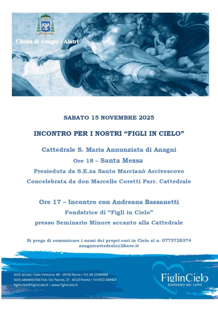 La Cattedrale di Santa Maria Annunziata di Anagni si prepara ad accogliere sabato 15 novembre 2025 un evento dal profondo significato spirituale ed emotivo. La comunità diocesana si riunirà per un incontro speciale dedicato ai “figli in cielo”, un’occasione di preghiera, condivisione e sostegno reciproco per tutte le famiglie che hanno vissuto il dolore della perdita di una persona cara.