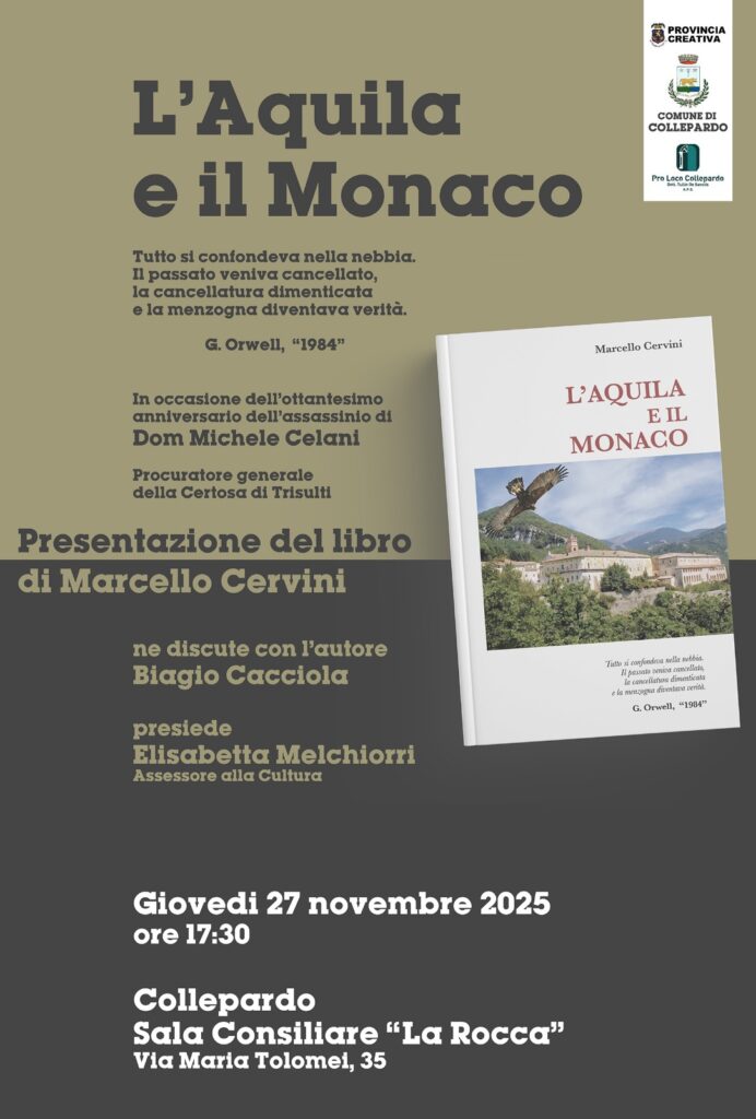 L’evento del 25 novembre rappresenta solo il primo tassello di una stagione culturale che accompagnerà il territorio verso il Natale con un calendario denso di appuntamenti. Già fissato per giovedì 27 novembre alle ore 17.30, sempre presso la Sala Consiliare “La Rocca”, il secondo incontro con la presentazione del libro “L’AQUILA E IL MONACO” di Marcello Cervini, promettendo nuove occasioni di confronto e arricchimento culturale.