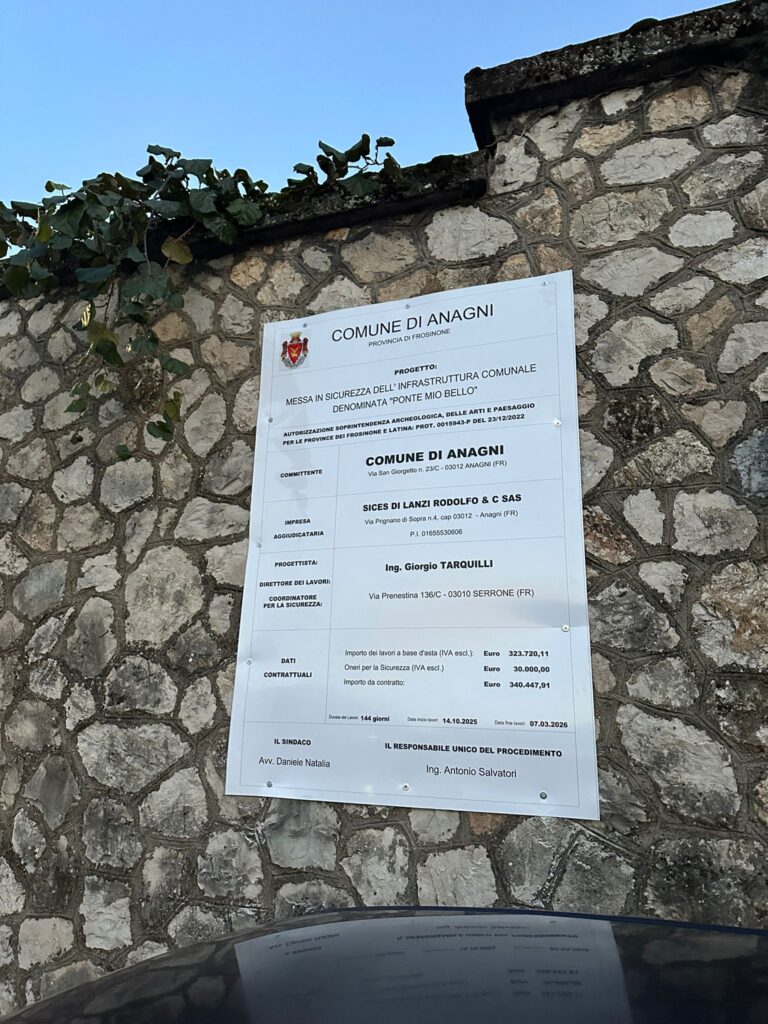 Sono ufficialmente partiti i tanto attesi lavori di messa in sicurezza del Ponte Mio Bello, una delle infrastrutture più importanti e delicate del territorio di Anagni. L’intervento, che costerà alle casse del Comune di Anagni circa 340mila euro, rappresenta una risposta necessaria alle criticità strutturali emerse negli ultimi tempi e che avevano sollevato non poche preoccupazioni tra cittadini e tecnici.