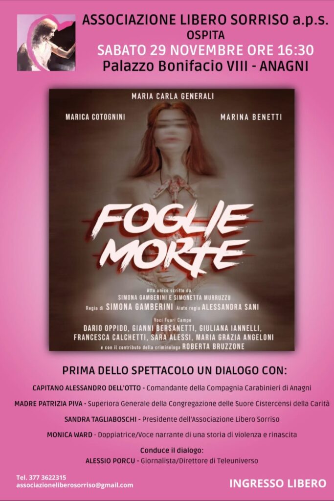 Sabato 29 novembre, alle ore 16:30, le prestigiose sale di Palazzo Bonifacio VIII ad Anagni ospiteranno lo spettacolo teatrale “Foglie Morte”, una rappresentazione intensa e toccante che affronta con sensibilità e profondità emotiva uno dei drammi più urgenti della società contemporanea. La regia è affidata a Simona Gamberini, mentre la voce fuori campo sarà quella della celebre criminologa Roberta Bruzzone, volto noto al grande pubblico per il suo impegno nell’analisi dei casi di violenza e femminicidio.