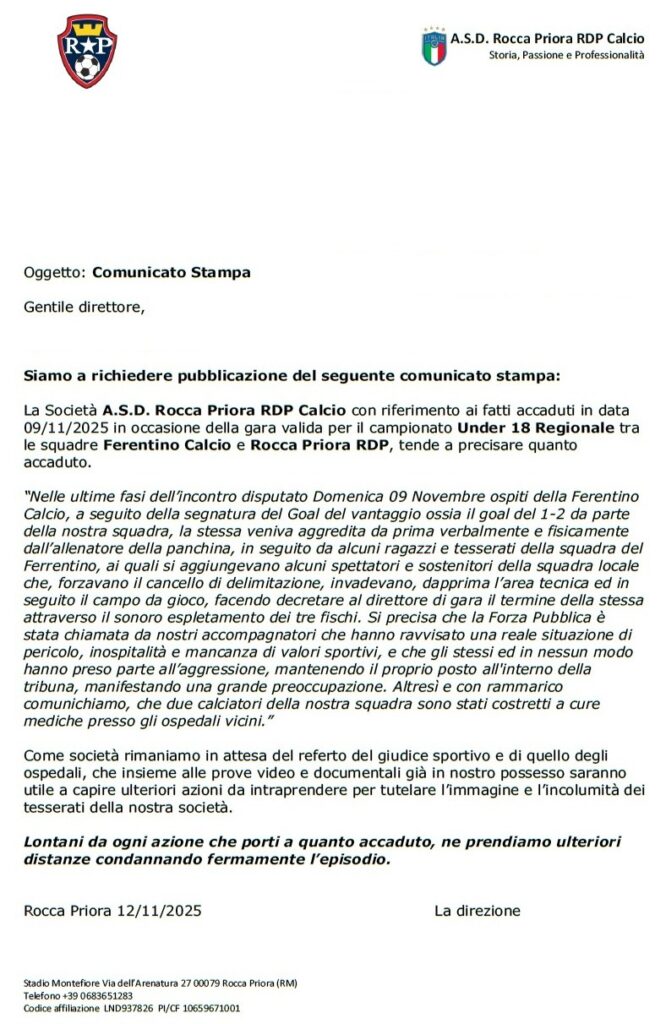 Riportiamo di seguito la nota stampa inviata a questa redazione dalla direzione della società A.S.D. Rocca Priora DPD Calcio, in riferimento ai fatti accaduti lo scorso 9 novembre durante la gara tra Ferentino Calcio e Rocca Priora, Under 18 regionale: