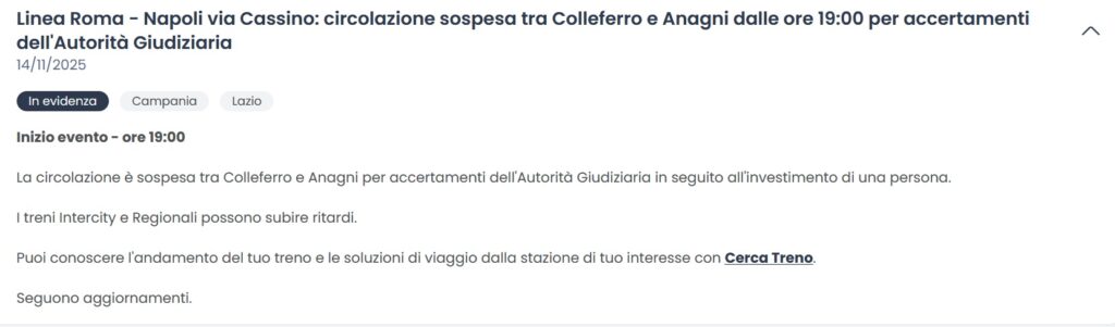 Grave incidente nel tardo pomeriggio di oggi lungo la linea Roma – Cassino, una delle direttrici più frequentate del Lazio. Intorno alle 19, una persona è stata investita tra le stazioni di Colleferro e Anagni-Fiuggi, in un tratto particolarmente trafficato soprattutto nelle fasce serali.