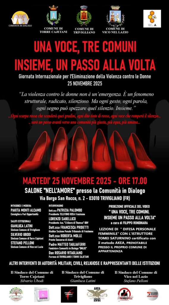 Trivigliano – Tre comuni, un’unica voce contro la violenza di genere. In occasione della Giornata Internazionale per l’Eliminazione della Violenza contro le Donne, i Comuni di Trivigliano, Vico nel Lazio e Torre Cajetani si mettono insieme per dare vita a un’iniziativa istituzionale che punta dritto al cuore della comunità. Si chiama “Una Voce, Tre Comuni – Insieme, un Passo alla Volta” ed è molto più di un semplice evento: è un segnale forte, un impegno collettivo, un patto tra istituzioni e cittadini per costruire una società più giusta e rispettosa.