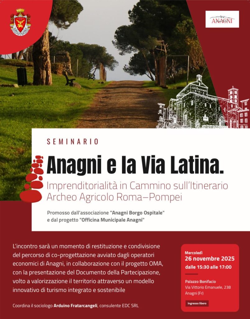Un nuovo modello di turismo integrato e sostenibile sta prendendo forma ad Anagni, con l’obiettivo di valorizzare il territorio attraverso l’antica Via Latina e l’itinerario archeo-agricolo Roma-Pompei. Mercoledì 26 novembre, dalle ore 15:30 alle 17:00, Palazzo Bonifacio ospiterà il seminario “Anagni e la Via Latina. Imprenditorialità in Cammino sull’Itinerario Archeo Agricolo Roma-Pompei“, un appuntamento cruciale per il futuro turistico ed economico del territorio.