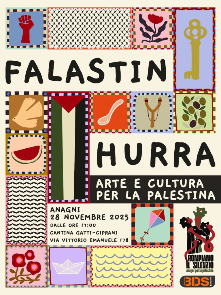 Venerdì 28 novembre 2025 Anagni apre le porte a un evento culturale di grande rilevanza: FALASTIN HURRA, una serata dedicata all’arte e alla cultura palestinese che si terrà presso la storica Cantina Gatti-Ciprani in via Vittorio Emanuele 178. Un’occasione unica per la cittadinanza di avvicinarsi, attraverso linguaggi culturali e testimonianze dirette, a una delle questioni più complesse e dibattute del panorama internazionale contemporaneo.