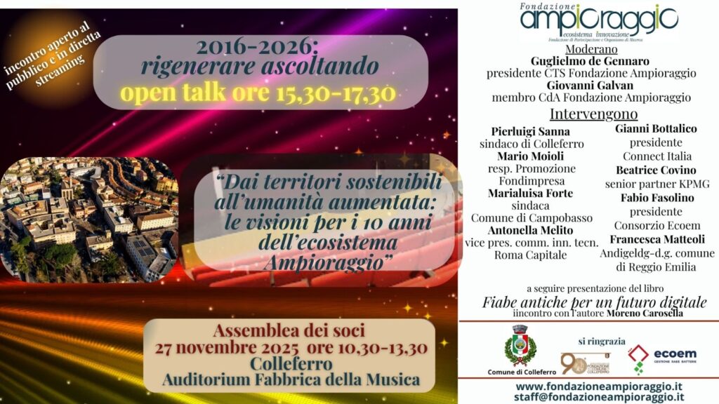 Il 28 novembre, presso la Biblioteca Comunale, prenderà il via l’Ampio Raggio Day – Giorno 1. L’intera giornata sarà dedicata al workshop “Città dell’Innovazione”, con sessioni plenarie e l’avvio dei laboratori rivolti ad amministratori, imprese, associazioni e scuole del territorio. Sarà l’occasione per condividere idee, competenze ed esperienze, progettando servizi e strumenti capaci di rendere Colleferro un laboratorio permanente di innovazione urbana.