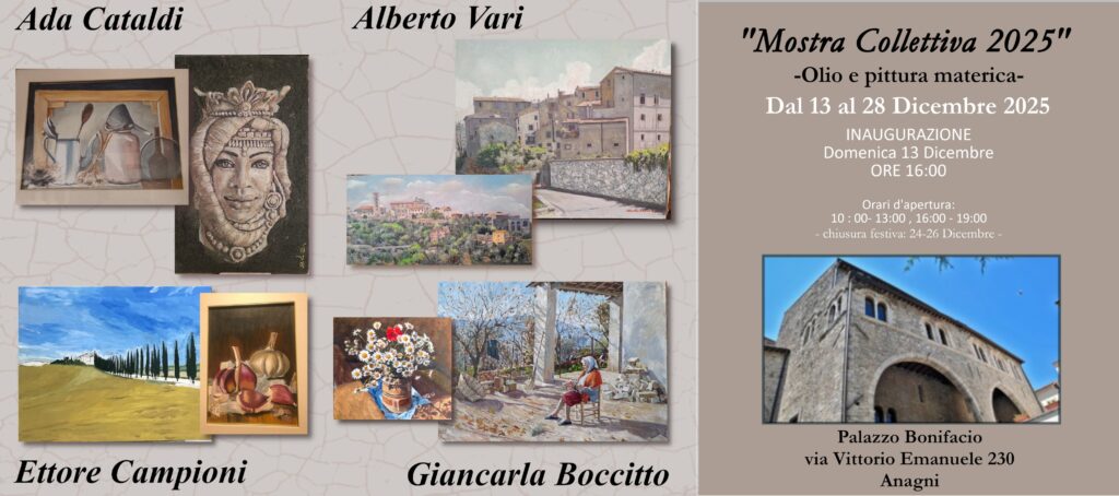 Nel cuore della città, tra le pietre millenarie che raccontano secoli di storia, si prepara ad aprire i battenti un nuovo appuntamento con l’arte contemporanea. Dal 13 al 28 dicembre 2025, Palazzo Bonifacio ad Anagni ospiterà la Mostra Collettiva 2025, un’esposizione che riunisce quattro artisti del territorio in un dialogo silenzioso fatto di colori, forme e sensibilità diverse.