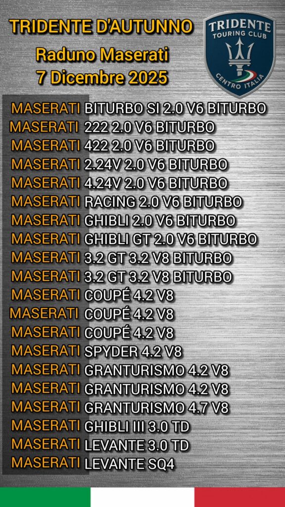 L’evento, battezzato “Il Tridente d’Autunno”, è organizzato dal Tridente Touring Club Centro Italia, nato dall’intuizione e dalla determinazione di Gianluca Testa, presidente del club, e del suo vice Kevin Salatino. Due amici, due collezionisti, un’unica grande passione che li ha spinti a riempire un vuoto evidente nel panorama motoristico del centro-sud Italia.