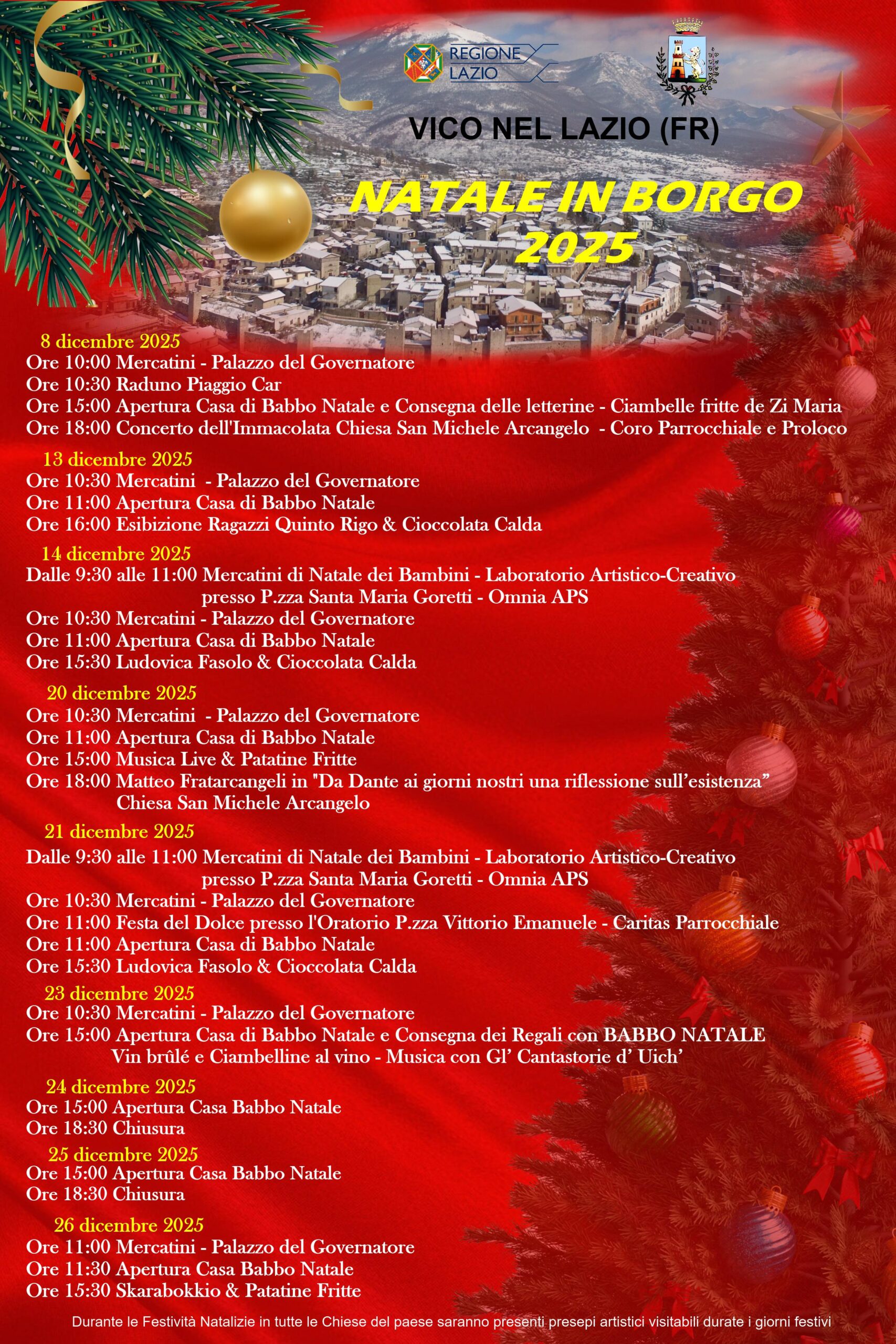 L’Amministrazione Comunale di Vico nel Lazio ha svelato il programma ufficiale di Natale in Borgo 2025, che si terrà dal 8 dicembre 2025 al 6 gennaio 2026, promettendo un periodo di festa all’insegna della magia, della tradizione e della comunità.
