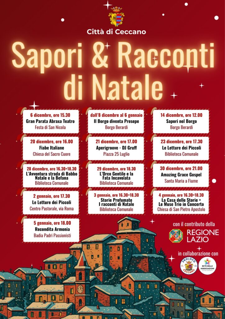 Ceccano si prepara a vivere le festività con Sapori & Racconti di Natale 2025, il cartellone promosso dal Comune di Ceccano che, dal 6 dicembre 2025 al 5 gennaio 2026, trasformerà la città in un mosaico di spettacoli, musica, teatro, tradizioni e atmosfere suggestive.