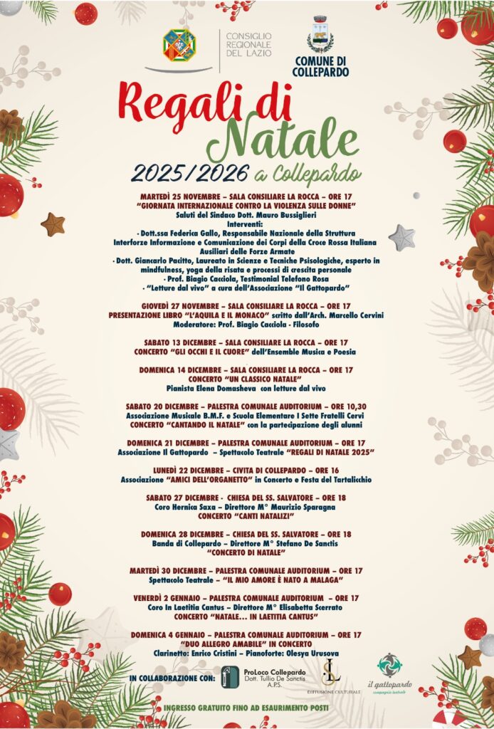Il cartellone dal titolo “Regali di Natale 2025/2026” si apre simbolicamente martedì 25 novembre nella Sala Consiliare “La Rocca” alle ore 17.00 con la Giornata Internazionale contro la Violenza sulle Donne, un momento di sensibilizzazione e riflessione su un tema di drammatica attualità. Una scelta non casuale che dimostra come la cultura possa e debba essere anche strumento di impegno civile e sociale.