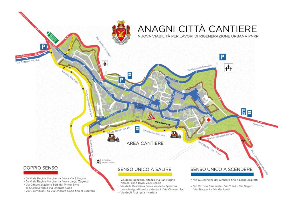 Il Comune di Anagni è infatti beneficiario di un importante finanziamento PNRR destinato alla riqualificazione del versante sud della città, in particolare Via Circonvallazione Sud e l’area urbana denominata “Via degli Orti”. Un’opera attesa che comporterà inevitabilmente l’occupazione di parte della carreggiata e che ha reso indispensabile ripensare l’intera viabilità dell’anello cittadino.