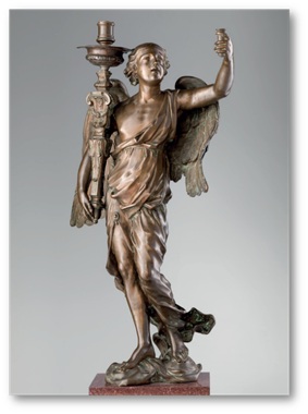La posa simmetrica dei due angeli rivela la loro funzione originaria: erano stati creati per essere collocati ai lati di un altare, dialogando tra loro in una perfetta armonia compositiva. Con un braccio esteso verso il centro, ciascuno regge un piccolo contenitore cilindrico per candele di dimensioni ridotte, mentre l’altro braccio, disteso lungo il corpo, sostiene un grande porta-torcia destinato a ospitare candele di maggiori dimensioni.