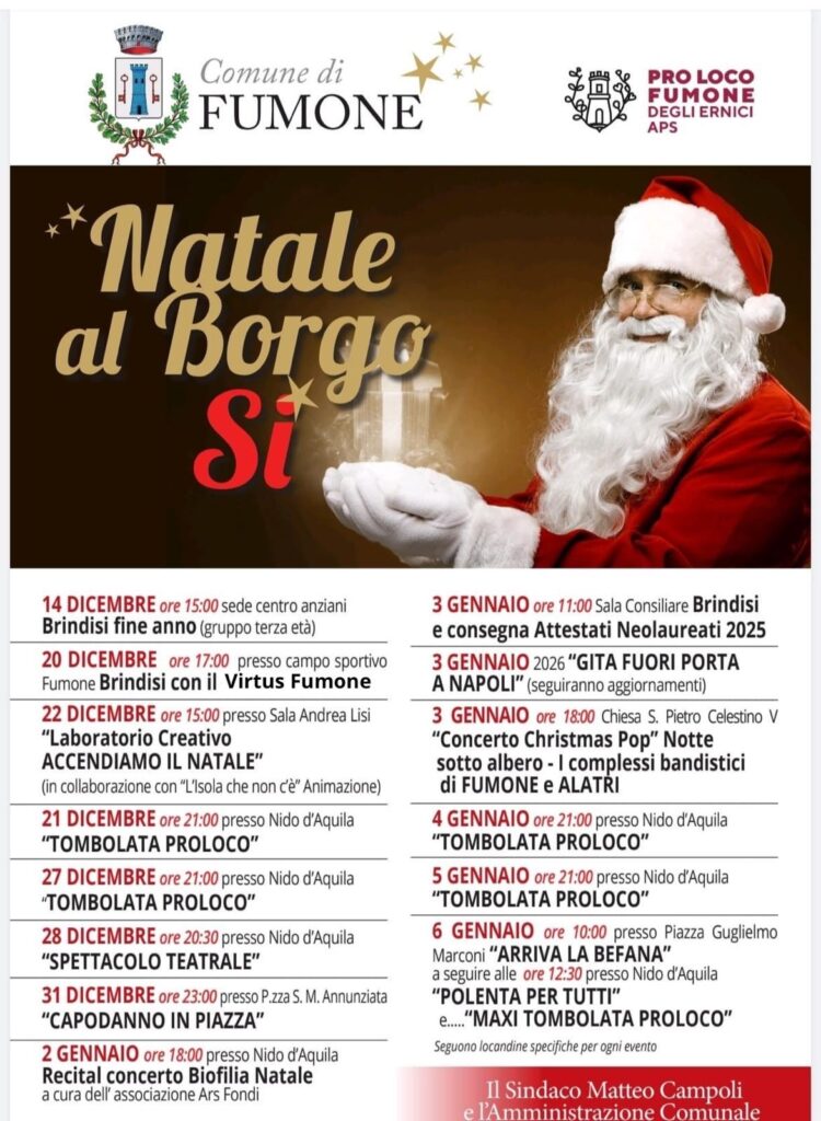 Il Comune di Fumone, in collaborazione con la Pro Loco Fumone degli Ernici APS e con le associazioni del territorio, presenta “Natale al Borgo Sì”, una rassegna di appuntamenti pensata per accompagnare cittadini e visitatori lungo tutto il periodo delle festività, dal 14 dicembre al 6 gennaio, valorizzando la magia del Natale e lo straordinario fascino del borgo.