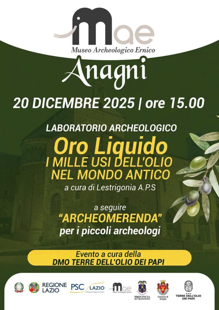 Anagni – Il Museo Archeologico Ernico di Anagni diretto dalla dott.ssa Manuela Cerqua apre le sue porte il 20 dicembre 2025, alle ore 15.00, per un affascinante laboratorio archeologico dedicato all’olio, una delle risorse più preziose del mondo antico. L’evento, a ingresso gratuito, è curato dall’Associazione Lestrigonia A.P.S. e si propone di guidare i visitatori in un viaggio tra storia, archeologia e tradizione, per scoprire perché l’olio fosse considerato un vero e proprio oro liquido.