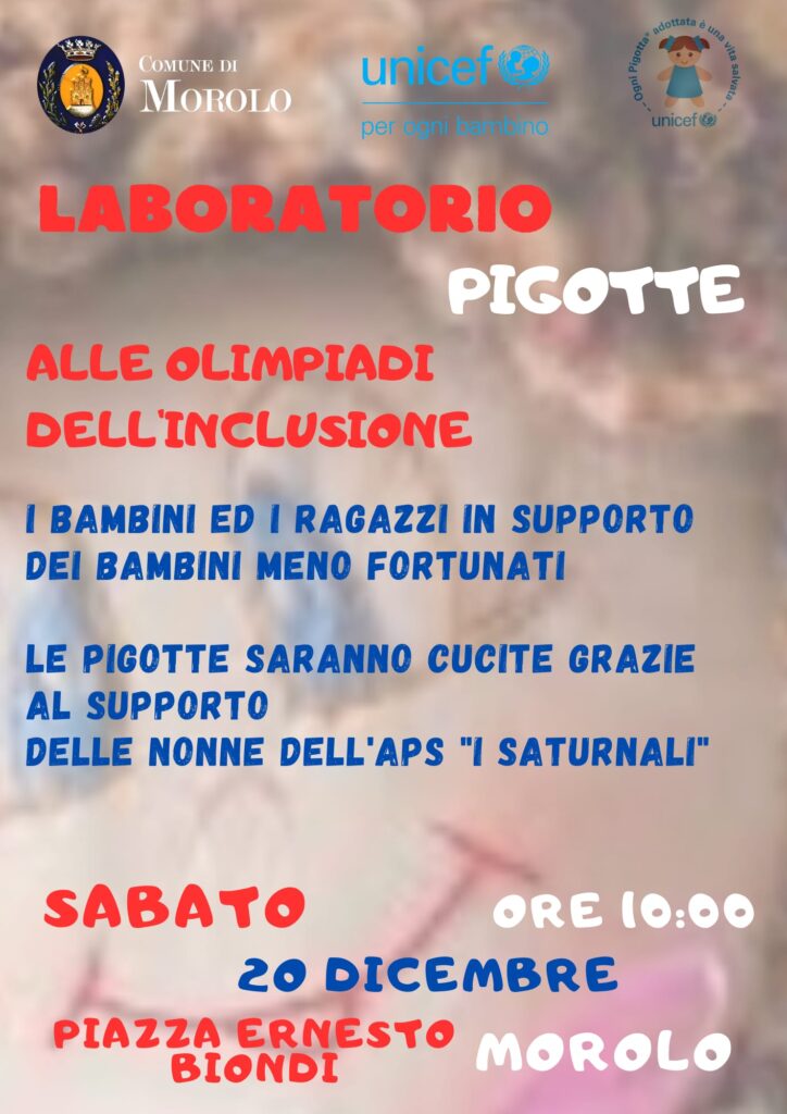 Non mancherà l’UNICEF, che presenterà la storica campagna “Adotta una Pigotta”, le bambole di pezza simbolo di solidarietà internazionale verso i bambini bisognosi. Quest’anno le Pigotte verranno cucite con l’aiuto prezioso delle nonne dell’APS “I Saturnali”, che metteranno a disposizione esperienza, maestria e tanto amore per dare vita a questi simboli di speranza.