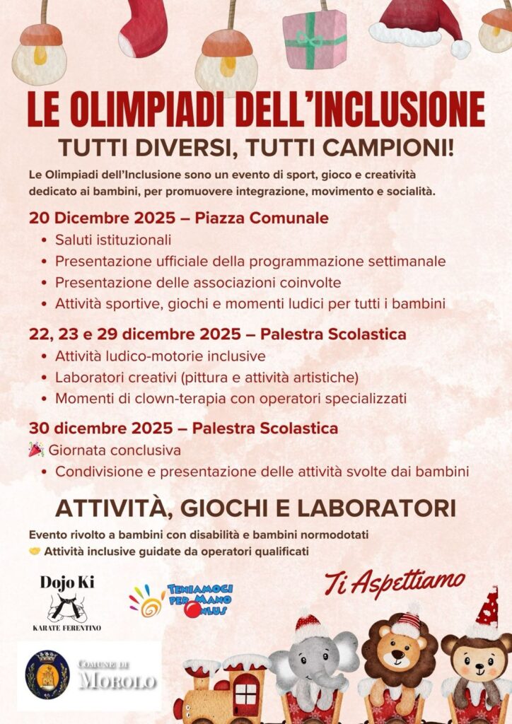 Una domenica all’insegna dell’inclusione, dello sport e della solidarietà. Il Comune di Morolo, in collaborazione con l’ASD Dojo Ki Karate Ferentino, si prepara ad accogliere cittadini, famiglie e ospiti per le Olimpiadi dell’Inclusione, un evento che celebra le differenze come una vera forza e che trasforma la piazza in un luogo di incontro, festa e condivisione.