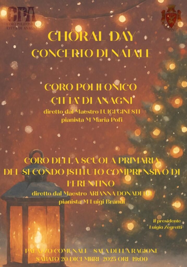La musica corale torna a essere protagonista ad Anagni con uno degli appuntamenti più attesi del periodo natalizio. Sabato 20 dicembre 2025, alle ore 19.00, la suggestiva Sala della Ragione di Anagni ospiterà il tradizionale Choral Day, evento patrocinato dal Comune di Anagni e ormai divenuto un punto di riferimento nel calendario culturale cittadino.