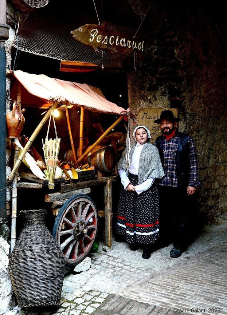 Il percorso prende avvio da via Porta della Valle e conduce al cuore spirituale della rappresentazione: la Natività, allestita all’interno della chiesa di Santa Maria. Qui, come da tradizione, viene deposto il Bambino, interpretato da un vero neonato, con mamma e papà accanto. Dal momento più sacro si passa poi a quello più folkloristico, lungo Via Civita e Via Porta di Ferro, dove la vita del borgo si manifesta in tutta la sua vitalità.