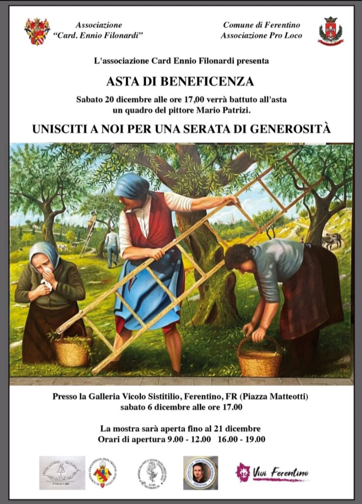 Sull’onda del grande successo riscosso dalla mostra d’arte La Terra Promessa, in corso a Ferentino fino al 21 dicembre presso la Galleria Vicolo Sistitilio, nasce un’iniziativa che unisce bellezza e solidarietà. L’Associazione Cardinale Ennio Filonardi, colpita dalla calorosa accoglienza che la città ha riservato al pittore Mario Patrizi, ha condiviso l’idea che un evento così intenso e suggestivo potesse trasformarsi anche in un momento di autentica generosità e altruismo.