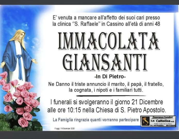 La comunità di Fiuggi è profondamente addolorata per la scomparsa di Immacolata Giansanti, venuta a mancare oggi, 19 dicembre 2025, nella clinica San Raffaele di Cassino all’età di soli 48 anni. La notizia ha scosso amici, conoscenti e familiari, riuniti nel dolore per la perdita di una figura stimata e benvoluta in città, anche per via del suo lavoro presso la ASL.
