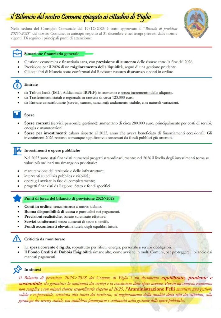 L’amministrazione Felli consegna così alla comunità pigliese un bilancio che nelle intenzioni della giunta rappresenta un equilibrio tra prudenza contabile e attenzione alle esigenze del territorio. In un momento storico caratterizzato da incertezze economiche e da pressioni crescenti sui bilanci degli enti locali, Piglio sceglie la strada della stabilità fiscale.