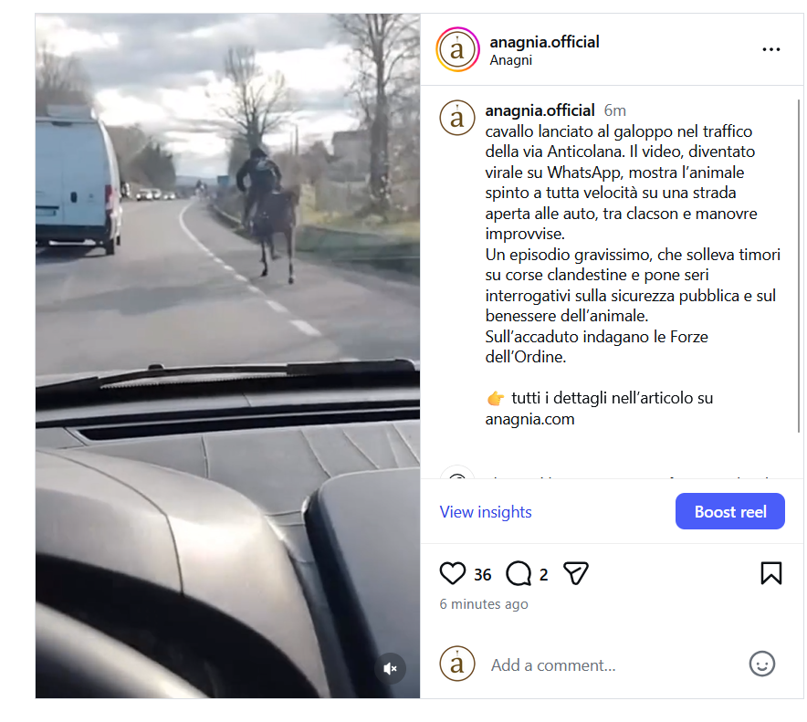 ANAGNI – Un video shock, diventato virale nel giro di poche ore sui gruppi whatsapp, indigna la comunità di Anagni – e non solo. Le immagini mostrano un cavallo con fantino in sella lanciato a tutta velocità lungo una delle arterie più trafficate della città, in mezzo alle auto e ai mezzi in transito, in una scena che lascia poco spazio all’immaginazione e solleva interrogativi inquietanti.
