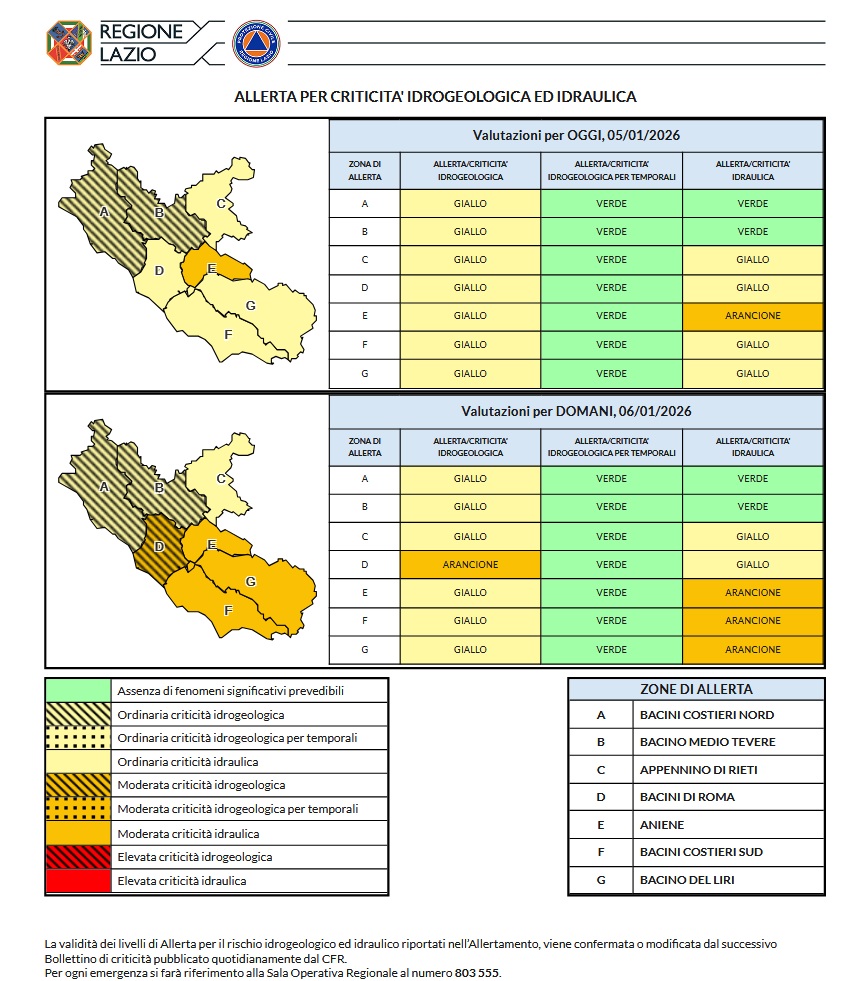 L’Epifania 2026 si presenta con un volto decisamente bagnato e freddo per il Lazio. La Protezione Civile regionale ha innalzato nella giornata di oggi, lunedì 5 gennaio, il livello di allerta da giallo ad arancione per l’intera giornata di domani, martedì 6 gennaio, a causa di precipitazioni intense che stanno flagellando la regione da giorni.
