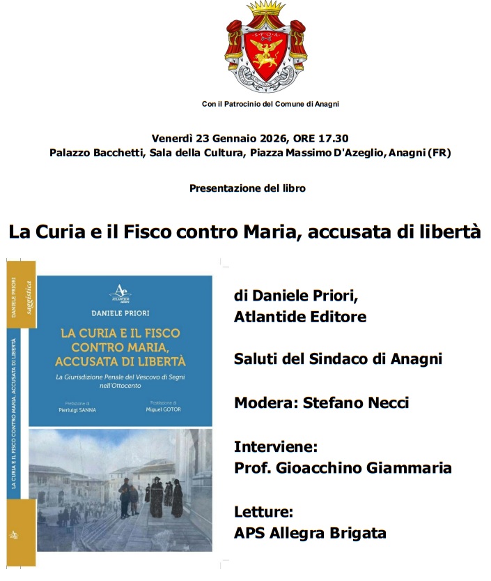 Venerdì 23 gennaio, alle ore 17:30, la Sala delle conferenze di Palazzo Bacchetti ad Anagni ospiterà la presentazione del volume intitolato La Curia e il Fisco contro Maria, accusata di libertà. L’opera, firmata dal giornalista e ricercatore Daniele Priori, rappresenta un’indagine meticolosa sulla giurisdizione penale del Vescovo di Segni durante il diciannovesimo secolo, un’epoca in cui la legge della Chiesa e quella dello Stato erano indissolubilmente intrecciate.