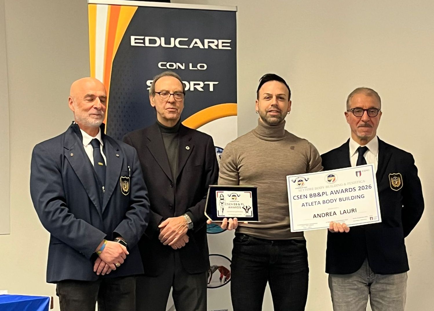 Ancora un traguardo importante per il bodybuilder di Anagni, Andrea Lauri, che ha ricevuto un prestigioso riconoscimento ai CSEN Awards, svoltisi nella sala conferenze del CONI a Roma. Il premio, destinato ai migliori atleti italiani, conferma la costanza e il livello raggiunto da Lauri in una carriera iniziata nel 2015.