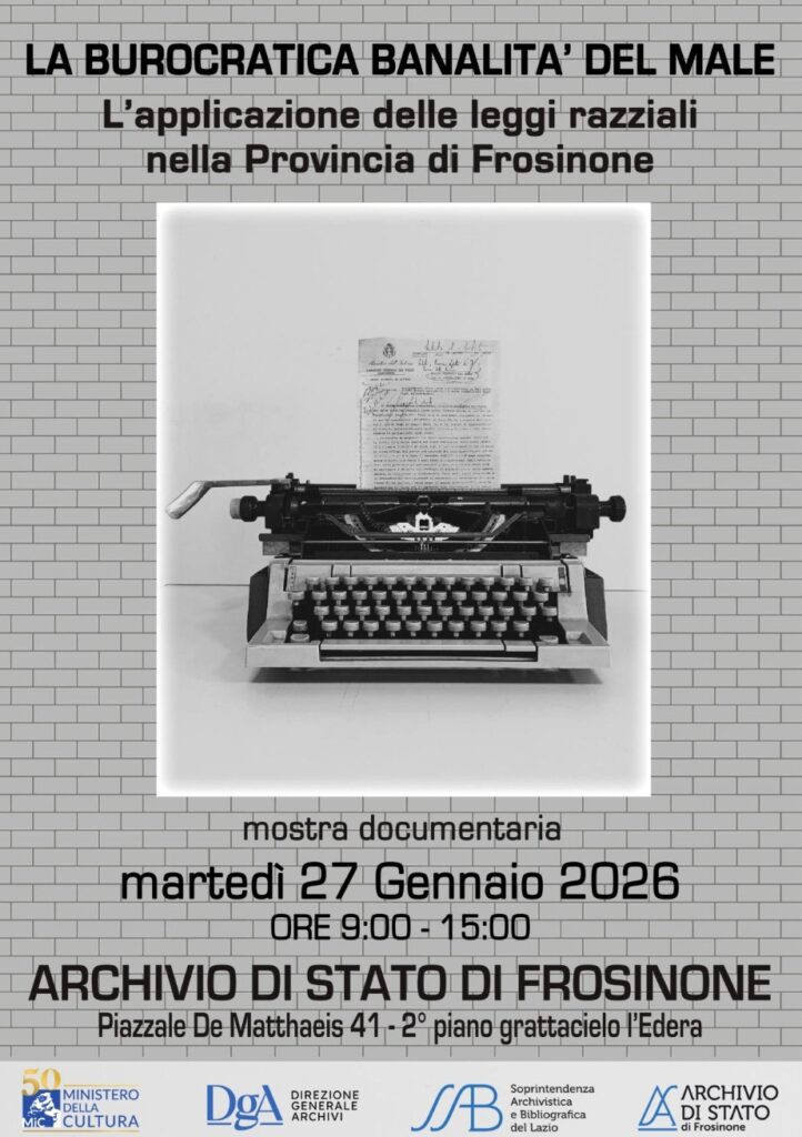 La storia non è fatta solo di grandi proclami ma spesso si nasconde tra le pieghe ingiallite di fascicoli amministrativi e protocolli d’ufficio. Per celebrare il Giorno della Memoria, l’Archivio di Stato di Frosinone ha deciso di accendere un faro su una delle pagine più buie del Novecento italiano, analizzandola da una prospettiva squisitamente locale e documentaria. Martedì 27 gennaio 2026, le sale dell’istituto situate al secondo piano del Grattacielo L’Edera ospiteranno una mostra dal titolo emblematico che richiama le riflessioni di Hannah Arendt: la burocratica banalità del male.