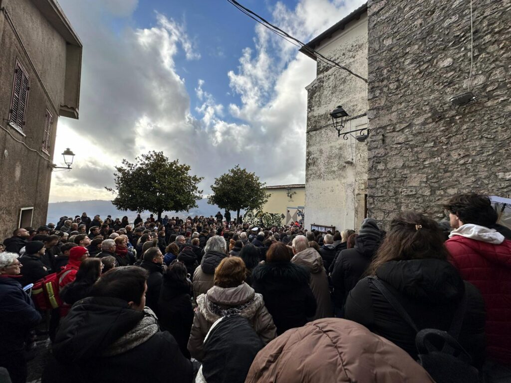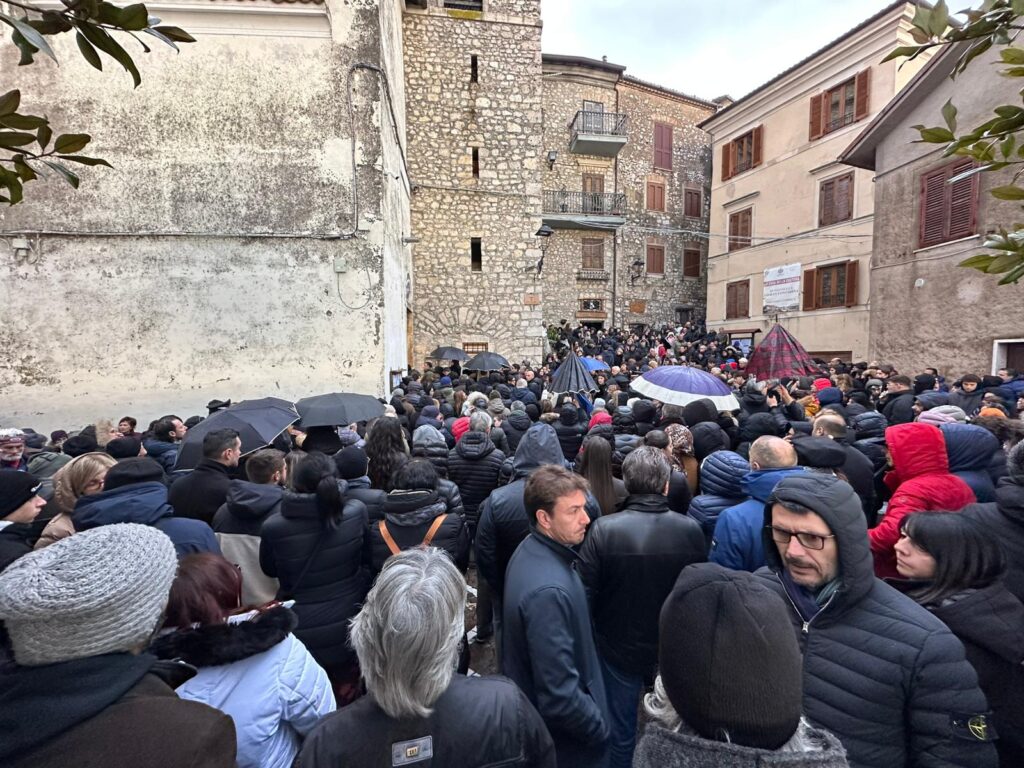 La chiesa di Santa Maria Assunta, nel pieno centro storico del paese, non è riuscita a contenere l’enorme folla accorsa per il funerale. All’interno e all’esterno, lungo le vie adiacenti, si è riversata un’intera comunità, unita in un abbraccio lungo e composto, capace di tenere insieme commozione, rispetto e vicinanza sincera.