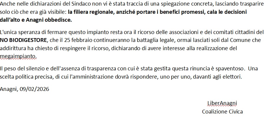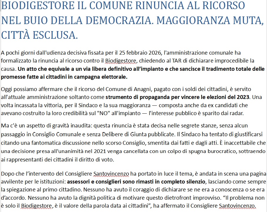 Doveva essere un consiglio dedicato a variazioni di bilancio e tecnicismi amministrativi, ma la seduta di questa mattina, 9 febbraio 2026, si è trasformata in un vero e proprio scontro frontale sul futuro ambientale di Anagni. Al centro del dibattito la clamorosa notizia del deposito di un atto processuale con cui il Comune di Anagni ha formalizzato la rinuncia al ricorso contro il biodigestore. Una decisione che, a pochi giorni dall’udienza decisiva del 25 febbraio, suona come un via libera definitivo al mega-impianto.