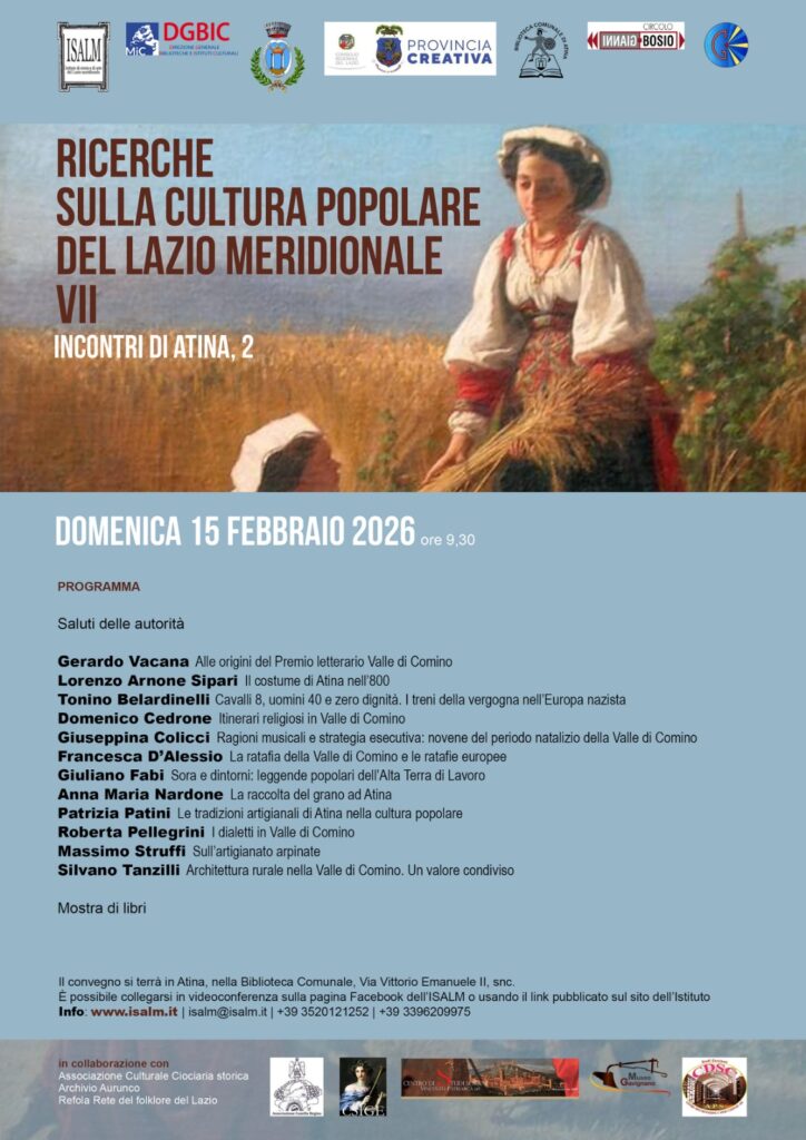 ATINA – Domenica 15 febbraio, a partire dalle ore 9.30, la biblioteca comunale di Atina ospiterà il secondo appuntamento degli “Incontri di Atina”, iniziativa promossa dal Istituto di Storia e Arte del Lazio Meridionale (ISALM) dedicata alla cultura popolare del Lazio meridionale e, in particolare, della Valle del Comino.