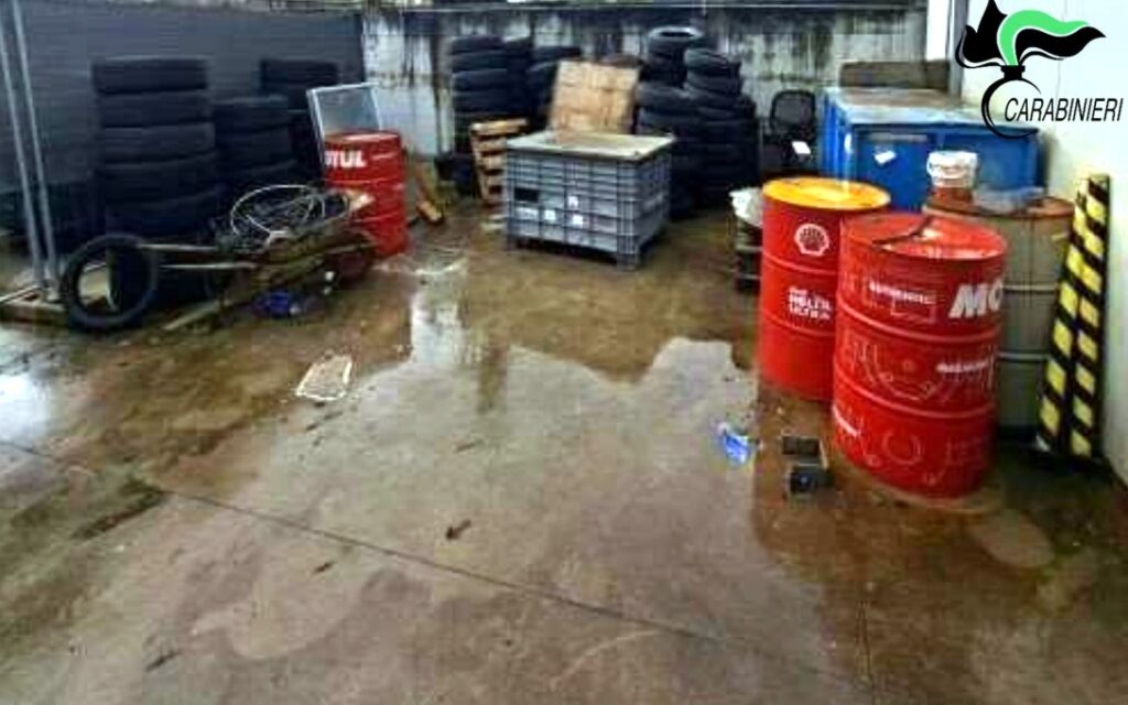 L’occhio attento dei Carabinieri Forestali si è subito posato su un’area pavimentata di circa 20 metri quadrati. Lo spiazzo, privo di copertura, veniva utilizzato per lo stoccaggio di materiali pesanti e residui di lavorazione, ma risultava completamente sprovvisto del sistema di raccolta e trattamento delle acque meteoriche. Tra fusti di olio motore, contenitori carichi di batterie per auto esauste, parti meccaniche imbrattate e pneumatici fuori uso, l’acqua piovana scorreva liberamente trascinando con sé residui oleosi e idrocarburi.