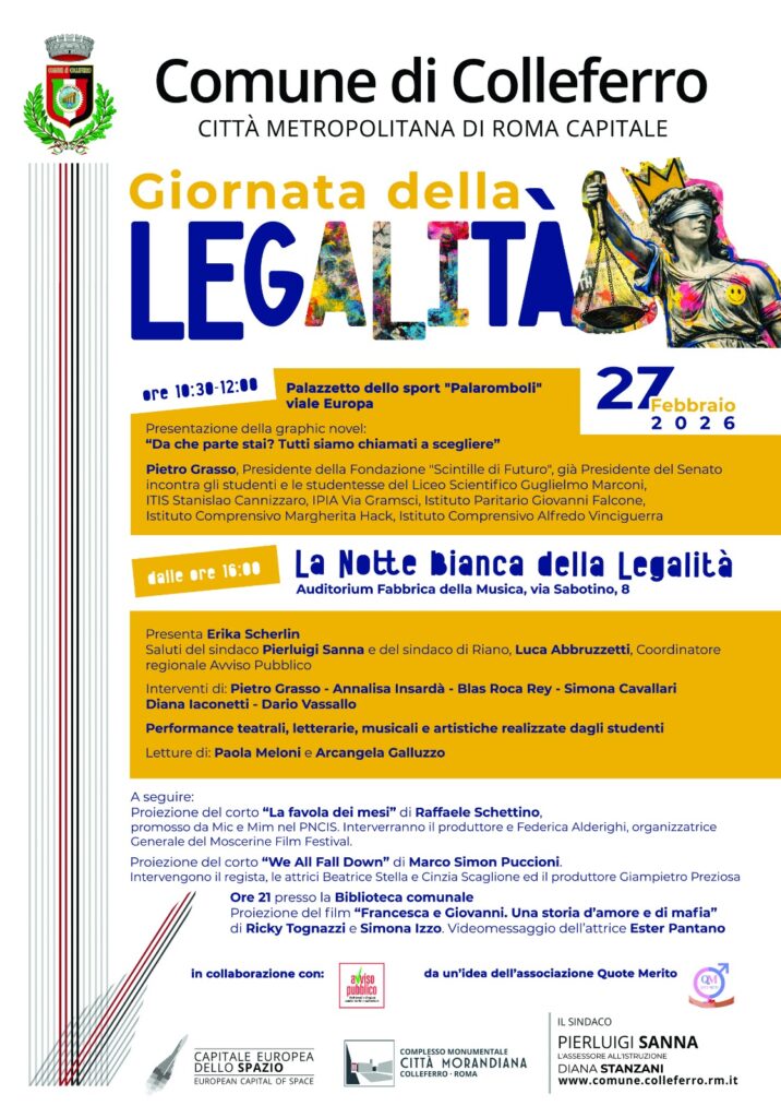 Il 27 febbraio Colleferro vivrà una giornata di grande significato civile e istituzionale con la Giornata della Legalità, promossa dal Comune in collaborazione con Avviso Pubblico. L’evento avrà inizio alle ore 10.30 presso il Palazzetto dello Sport di viale Europa e coinvolgerà studenti e studentesse di numerosi istituti locali, tra cui il Liceo Scientifico Guglielmo Marconi, l’ITIS Stanislao Cannizzaro, l’IPIA, l’Istituto paritario Giovanni Falcone e gli Istituti Comprensivi Margherita Hack e Alfredo Vinciguerra.