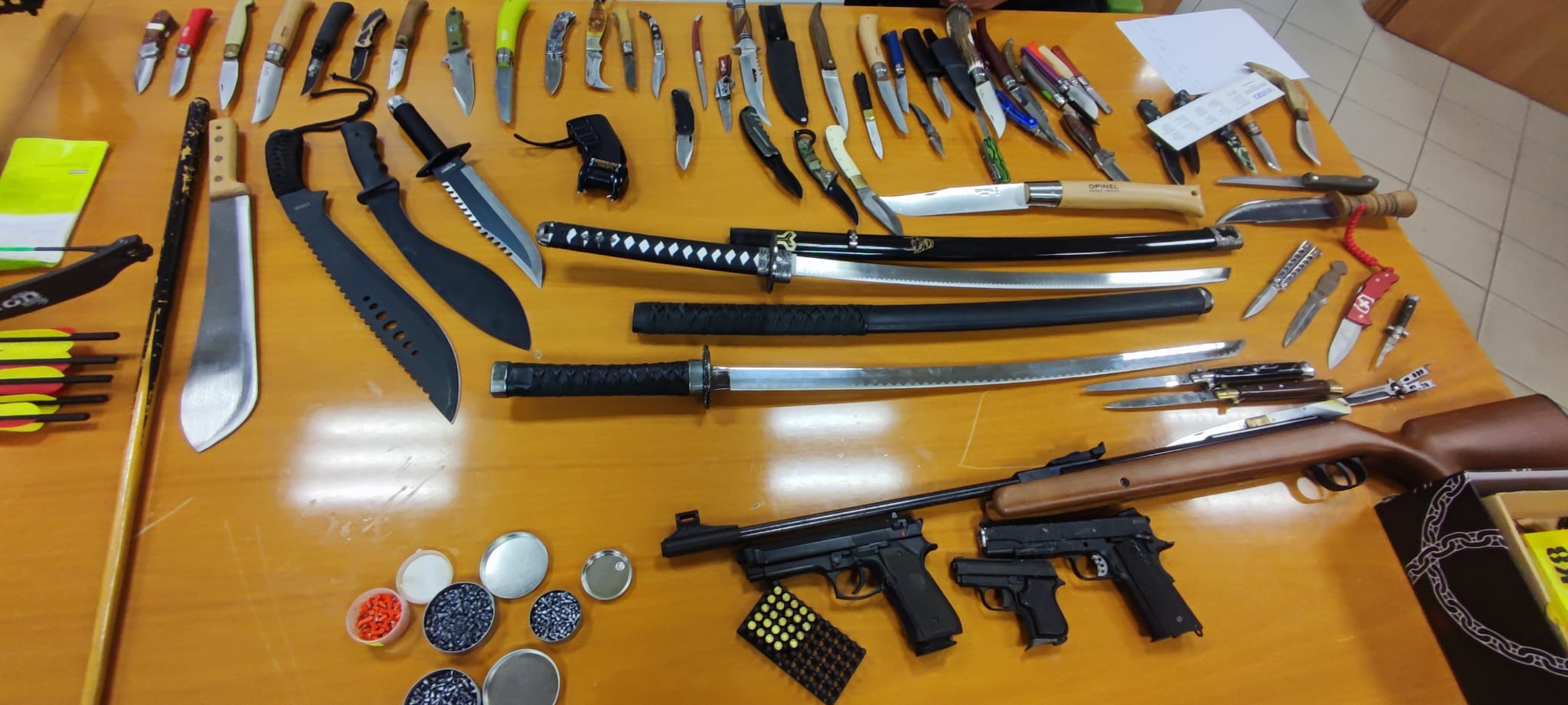 Nel corso delle operazioni è emersa anche la posizione del padre convivente. Nella sua disponibilità sono stati trovati circa tre grammi di cocaina e una serie di oggetti che hanno destato particolare allarme: tre pistole a salve prive del tappo rosso, un fucile ad aria compressa, numerosi coltelli a serramanico, pugnali, coltelli a farfalla e un dissuasore elettrico il cui porto è vietato.