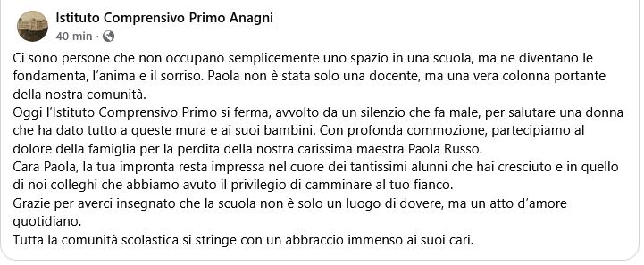 Ma Paola Russo era, per chi l’ha conosciuta, molto più di una docente. Era una presenza rassicurante, un punto di riferimento capace di unire rigore e dolcezza, autorevolezza e vicinanza. Qualità rare, che la rendevano una figura di primo piano nella comunità di Anagni, stimata non soltanto dai suoi alunni ma anche dai colleghi e dalle famiglie che nel corso degli anni le avevano affidato i propri figli.