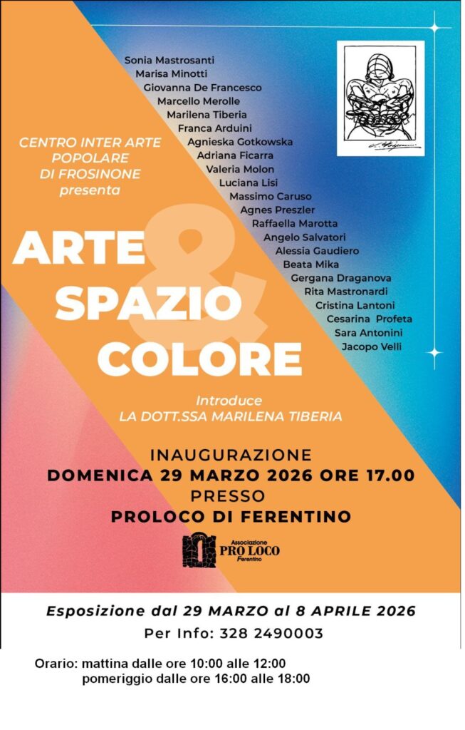 Ferentino si prepara ad accogliere un appuntamento di tutto rispetto per gli appassionati d’arte della provincia di Frosinone. Dal 29 marzo all’8 aprile, la sede della Pro Loco di Ferentino diventerà il palcoscenico di “Arte, Spazio e Colore”, la mostra collettiva promossa dal Centro Inter Arte di Frosinone che riunisce ben 22 artisti in un’unica, ambiziosa esposizione.