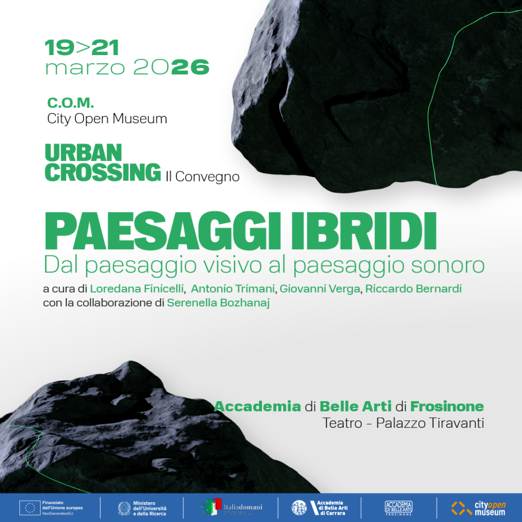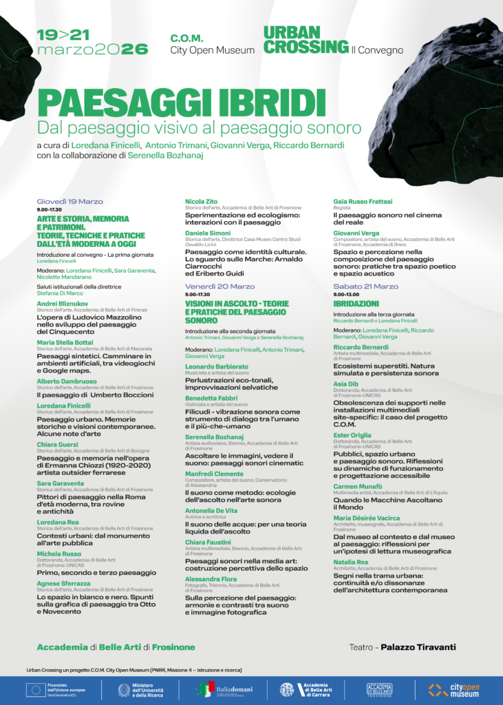 Dopo il percorso avviato con “Urban Crossing / Attraversamenti Urbani”, l’Accademia di Belle Arti di Frosinone rilancia il proprio impegno nella ricerca artistica contemporanea con “Paesaggi Ibridi – Dal paesaggio visivo al paesaggio sonoro”, un convegno che dal 19 al 21 marzo 2026 trasformerà il City Open Museum – Teatro Palazzo Tiravanti in un laboratorio aperto di idee, suoni e visioni.