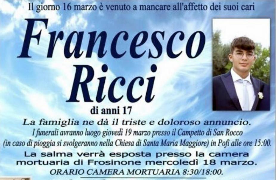 POFI – È una comunità profondamente colpita quella di Pofi, che si prepara a dare l’ultimo saluto a Francesco Ricci, il giovane di appena 17 anni venuto a mancare nella serata di lunedì 16 marzo 2026.